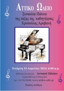 Ανοιξιάτικη-Πασχαλινή συναυλία σπουδαστών Πιάνου, Βιολιού, Φλάουτου, Κιθάρας & της Παιδικής Χορωδίας, των τάξεων των καθηγητών Γ. Παπαχρήστου, Β. Χριστοφίλου, Τ. Αναγνωστάκη, Π. Καραμούτσιου και Α. Βασιλείου θα πραγματοποιηθεί το Σάββατο του Λαζάρου 12 Απριλίου 2025, στις 6.30μμ, στην αίθουσα συναυλιών του Αττικού Ωδείου Ηλιούπολης (Πρωτοπαπά 30, Ηλιούπολη). Η είσοδος στη συναυλία είναι ελεύθερη. Για περισσότερες πληροφορίες παρακαλούμε καλέστε τη γραμματεία του Αττικού Ωδείου Ηλιούπολης: 210-9924574. περισσότερα