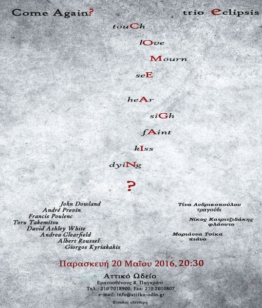 Μουσική δωματίου για φωνή, φλάουτο και πιάνο των: John Dowland, André Previn, Francis Poulenc, Toru Takemitsu, David Ashley White, Albert Roussel & Γιώργος Κυριακάκης.