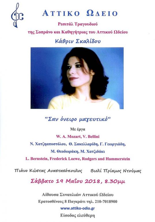 Ρεσιτάλ Τραγουδιού της Σοπράνο και Καθηγήτριας του Αττικού Ωδείου Κάθριν Σκαλίδου θα πραγματοποιηθεί το Σάββατο 19 Μαΐου 2018 στις 8.30μμ στην αίθουσα συναυλιών του Αττικού Ωδείου (Ερατοσθένους 8 Παγκράτι) με έργα W. A. Mozart, V. Bellini, Ν. Χατζηαποστόλου, Θ. Σακελλαρίδη, Γ. Γεωργιάδη, Μ. Θεοδωράκη, Μ. Χατζιδάκι, L. Bernstein, Frederick Loewe, Rodgers and Hammerstein,