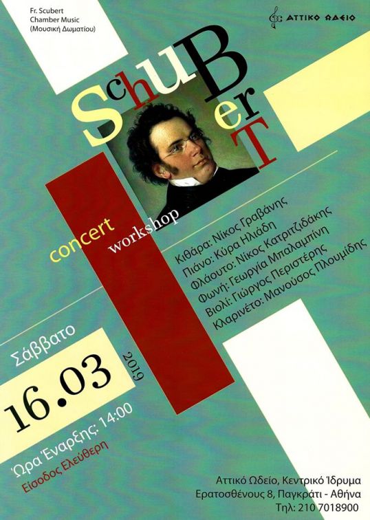 Σας προσκαλούμε στην Συναυλία-Workshop, που θα πραγματοποιηθεί στην Αίθουσα Συναυλιών του Κεντρικού Ιδρύματος Αττικού Ωδείου, με έργα μουσικής δωματίου και μετεγγραφές του συνθέτη Fr. Schubert, διαφορετικά ως προς τη δομή, τη σύνθεση οργάνων και τη χρονολογική τους δημιουργία, σε συνδυασμό με ανάλυση και παρουσίασή τους από τους συμμετέχοντες εκτελεστές.