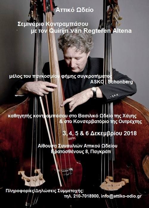 Σεμινάριο Κοντραμπάσου με τον Quirijn van Regteren Altena, μέλος του παγκοσμίου φήμης συγκροτήματος ASKO | Schonberg και καθηγητή κοντραμπάσου στο Βασιλικό Ωδείο της Χάγης & στο Κονσερβατόριο της Ουτρέχτης πραγματοποιήθηκε στις 4, 5 & 6 Δεκεμβρίου 2018 στην Αίθουσα Συναυλιών Αττικού Ωδείου