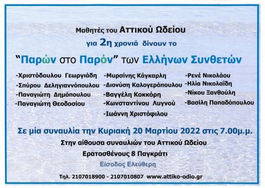 «Παρών στο Παρόν» των Ελλήνων συνθετών δίνουν για 2η φορά οι σπουδαστές του Αττικού ωδείου, με συναυλία με έργα Ελλήνων εν ζωή συνθετών, την Κυριακή 20 Μαρτίου 2022 στις 7.00 μ.μ στην αίθουσα συναυλιών του κεντρικού ιδρύματος του Αττικού ωδείου.