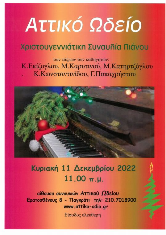 Εορταστικές Χριστουγεννιάτικες Μαθητικές Συναυλίες θα πραγματοποιηθούν την Κυριακή 11 Δεκεμβρίου 2022 στην αίθουσα συναυλιών του Κεντρικού Ιδρύματος του Αττικού Ωδείου, Ερατοσθένους 8 Παγκράτι: