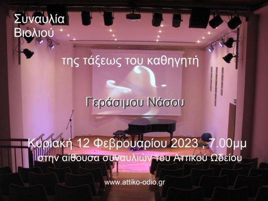 Συναυλία σπουδαστών Βιολιού, της τάξεως του καθηγητή Γεράσιμου Νάσου, θα πραγματοποιηθεί την Κυριακή 12 Φεβρουαρίου 2023, στις 7.00μμ, στην αίθουσα συναυλιών του κεντρικού ιδρύματος του Αττικού Ωδείου , Ερατοσθένους 8 Παγκράτι.