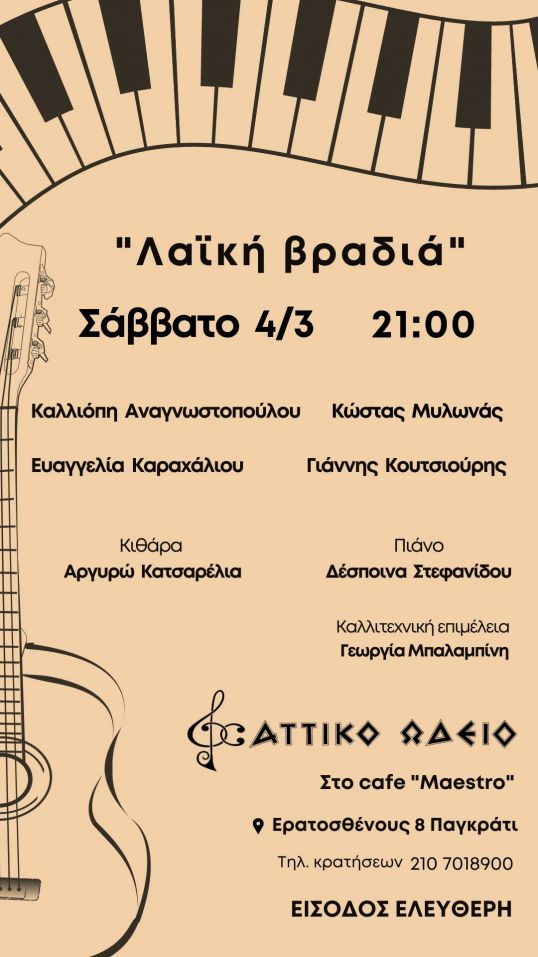 "Λαϊκή βραδιά" από σπουδαστές τραγουδιού θα πραγματοποιηθεί το Σάββατο 4 Μαρτίου 2023 στις 9.00μμ στο χώρο του Maestro Cafe, στο Κεντρικό Ίδρυμα του Αττικού Ωδείου (Ερατοσθένους 8 Παγκράτι) με την καλλιτεχνική επιμέλεια και διδασκαλία της καθηγήτριας Γεωργίας Μπαλαμπίνη.