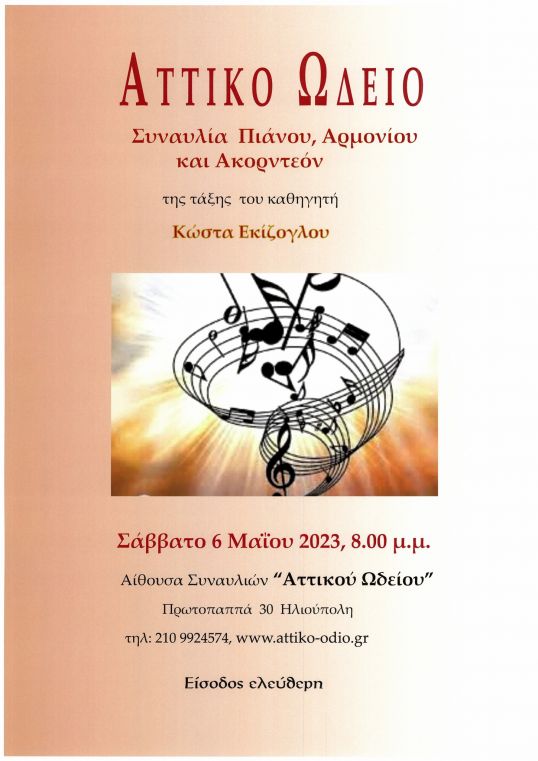 Συναυλία Πιάνου, Αρμονίου και Ακορντεόν, των μαθητών της τάξεως του καθηγητή Κ. Εκίζογλου, θα πραγματοποιηθεί το Σάββατο 6 Μαΐου στις 8.00μμ στην αίθουσα συναυλιών του παραρτήματος του Αττικού Ωδείου στην Ηλιούπολη (Πρωτοπαππά 30, Ηλιούπολη).