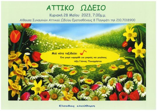 Συναυλία με θέμα το Παραμύθι του συγγραφέα Αντώνη Λαμπρινίδη, «Μία νότα ταξιδεύει», θα πραγματοποιηθεί την Κυριακή 28 Μαΐου 2023 στις 7.00μμ, στην αίθουσα συναυλιών του Αττικού Ωδείου, Ερατοσθένους 8 Παγκράτι.