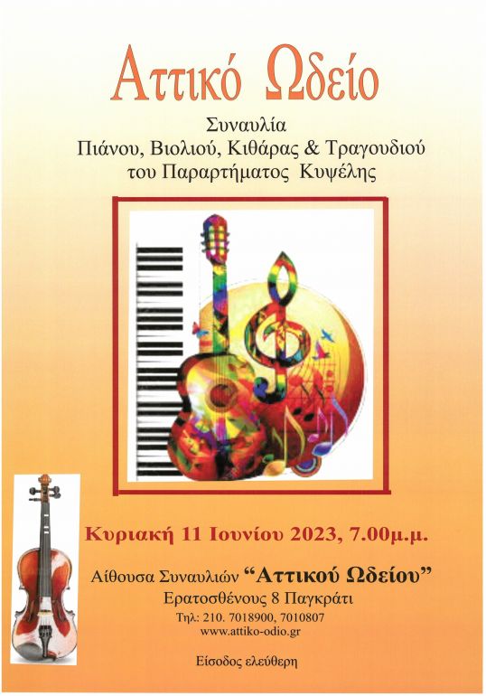 Συναυλία των σπουδαστών του Αττικού Ωδείου Κυψέλης, θα πραγματοποιηθεί την Κυριακή 11 Ιουνίου 2023 στις 7.00μμ, στην αίθουσα συναυλιών του Αττικού Ωδείου, Ερατοσθένους 8 Παγκράτι.