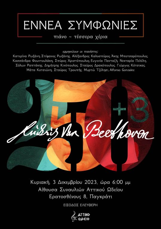 Με αφορμή την επέτειο των 250, συν 3 πλέον, χρόνων από τη γέννηση του Μπετόβεν, δεκαέξι πιανίστες ερμηνεύουν σε ντουέτα, μέρη από τις Εννέα Συμφωνίες του. Παράλληλα, μια σειρά από βίντεο αποκαλύπτουν γνωστές και άγνωστες πτυχές από τη ζωή του συνθέτη και τη δημιουργία των έργων αυτών. Η εκδήλωση φιλοξενείται (όπως και στον αρχικό προ τριετίας σχεδιασμό) στο Αττικό Ωδείο, στην Αίθουσα Συναυλιών.
