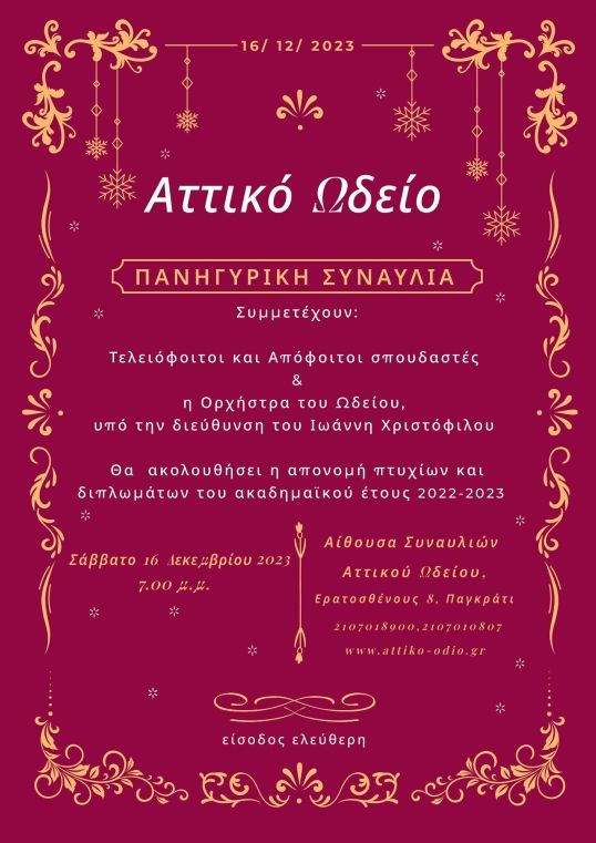 ⭐️ Το Αττικό Ωδείο σας προσκαλεί στην εορταστική εκδήλωση για την απονομή των αποκτηθέντων τίτλων σπουδών του ακαδημαϊκού έτους 2022-2023, το Σάββατο 16 Δεκεμβρίου 2023 στις 7.00μμ, στην αίθουσα συναυλιών του κεντρικού ιδρύματος του Ωδείου, Ερατοσθένους 8 Παγκράτι.