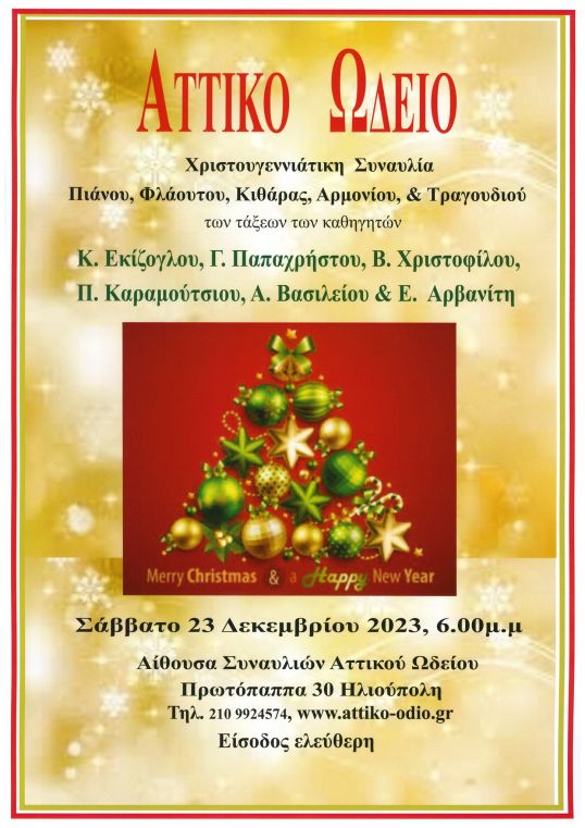 🎄 Χριστουγεννιάτικη Συναυλία σπουδαστών Πιάνου, Φλάουτου, Κιθάρας, Αρμονίου και Τραγουδιού, των τάξεων των καθηγητών Κ. Εκίζογλου, Γ. Παπαχρήστου, Β. Χριστοφίλου, Π. Καραμούτσιου, Α. Βασιλείου και Έ. Αρβανίτη, θα πραγματοποιηθεί το Σάββατο 23 Δεκεμβρίου 2023 στις 6.00μμ, στην αίθουσα συναυλιών του Αττικού Ωδείου Ηλιούπολης, Πρωτοπαππά 30, Ηλιούπολη.
