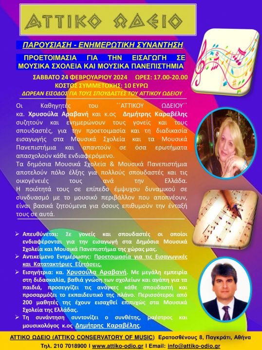 ΠΑΡΟΥΣΙΑΣΗ - ΕΝΗΜΕΡΩΤΙΚΗ ΣΥΝΑΝΤΗΣΗ με θέμα την ΠΡΟΕΤΟΙΜΑΣΙΑ ΓΙΑ ΤΗΝ ΕΙΣΑΓΩΓΗ ΣΕ ΜΟΥΣΙΚΑ ΣΧΟΛΕΙΑ & ΜΟΥΣΙΚΑ ΠΑΝΕΠΙΣΤΗΜΙΑ, θα πραγματοποιηθεί το Σάββατο 24 Φεβρουαρίου 2024, 17.00 -20.00, στην αίθουσα συναυλιών του Αττικού Ωδείου, Ερατοσθένους 8 Παγκράτι.