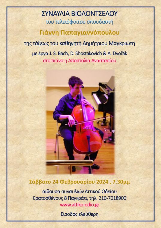 Συναυλία Βιολοντσέλου του τελειόφοιτου σπουδαστή Γιάννη Παπαγιαννόπουλου της τάξης του καθηγητή Δημήτριου Μαγκριώτη, με έργα J. S. Bach, D. Shostakovich & A. Dvořák, θα πραγματοποιηθεί τo Σάββατο 24 Φεβρουαρίου 2024 στις 7.30μμ, στην αίθουσα συναυλιών του Κεντρικού Ιδρύματος του Αττικού Ωδείου.