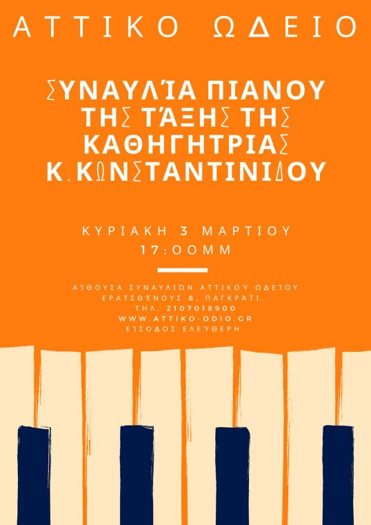 Συναυλία σπουδαστών Πιάνου της τάξης της καθηγήτριας Κωνσταντίνας Κωνσταντινίδου, θα πραγματοποιηθεί την Κυριακή 3 Μαρτίου 2024 στις 5:00μμ στην αίθουσα συναυλιών του Αττικού Ωδείου, Ερατοσθένους 8, Παγκράτι.