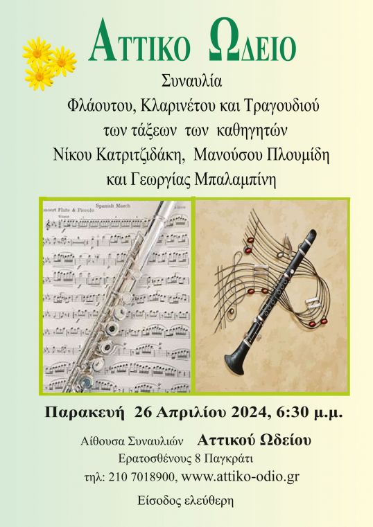 Συναυλία σπουδαστών Φλάουτου, Κλαρινέτου και Τραγουδιού των τάξεων των καθηγητών Νίκου Κατριτζιδάκη, Μανούσου Πλουμίδη και Γεωργίας Μπαλαμπίνη θα πραγματοποιηθεί την Παρασκευή 26 Απριλίου 2024 στις 6:30μμ στην αίθουσα συναυλιών του Αττικού Ωδείου, Ερατοσθένους 8, Παγκράτι.