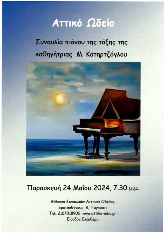 Συναυλία σπουδαστών Πιάνου της τάξης της καθηγήτριας Μαρίας Κατηρτζόγλου θα πραγματοποιηθεί την Παρασκευή 24 Μαΐου 2024 στις 7:30μμ στην αίθουσα συναυλιών του Αττικού Ωδείου, Ερατοσθένους 8, Παγκράτι.