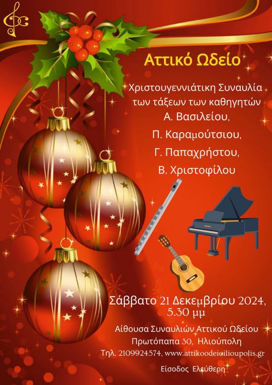 🎄Χριστουγεννιάτικη συναυλία σπουδαστών κιθάρας, φλάουτου & πιάνου, των τάξεων των καθηγητών Α. Βασιλείου, Π. Καραμούτσιου, Γ. Παπαχρήστου και Β. Χριστοφίλου, θα πραγματοποιηθεί το Σάββατο 21 Δεκεμβρίου 2024, στις 5.30μμ, στην αίθουσα συναυλιών του Αττικού Ωδείου Ηλιούπολης (Πρωτοπαπά 30, Ηλιούπολη).