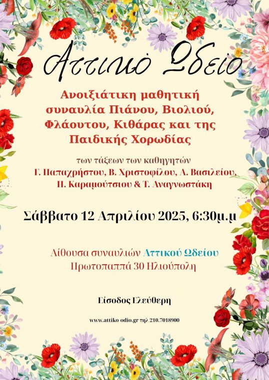 Ανοιξιάτικη-Πασχαλινή συναυλία σπουδαστών Πιάνου, Βιολιού, Φλάουτου, Κιθάρας & της Παιδικής Χορωδίας, των τάξεων των καθηγητών Γ. Παπαχρήστου, Β. Χριστοφίλου, Τ. Αναγνωστάκη, Π. Καραμούτσιου και Α. Βασιλείου θα πραγματοποιηθεί το Σάββατο του Λαζάρου 12 Απριλίου 2025, στις 6.30μμ, στην αίθουσα συναυλιών του Αττικού Ωδείου Ηλιούπολης (Πρωτοπαπά 30, Ηλιούπολη).