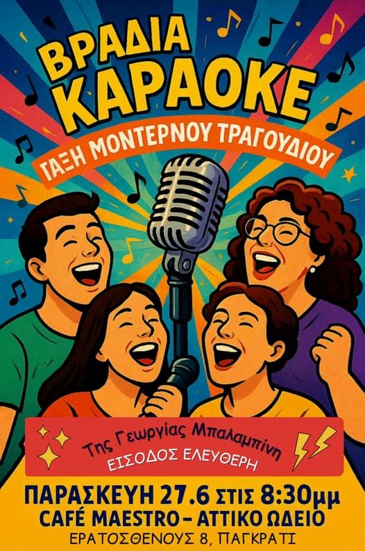 Βραδιά Καραόκε, την Παρασκευή 27 Ιουνίου 2025 στις 8.30μμμ, στο Café Maestro του Αττικού Ωδείου, με τους σπουδαστές της τάξης της καθηγήτριας Γεωργίας Μπαλαμπίνη!!! 🎤🎹❣️