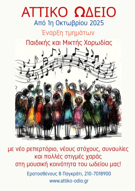-Παιδική Χορωδία: κάθε Τετάρτη 19.00-20.00 ή Σάββατο 11.00-12.00, για παιδιά ηλικίας από 7 ετών.
